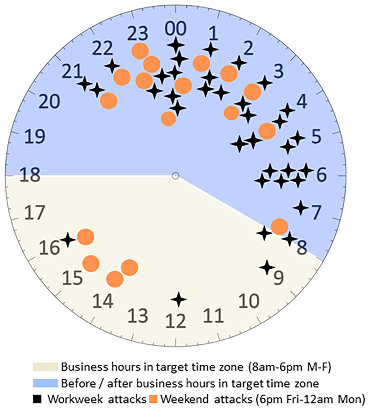 Concernant les attaques associées à une heure précise de la journée, pour chaque cas, nous avons traité “l’heure locale” comme le fuseau horaire du siège social fonctionnel du client. Dans le cas d’entreprises opérant sur plusieurs sites, empêchant ainsi d’identifier de manière concluante un seul fuseau horaire “local” (par exemple, les entreprises possédant plusieurs sites importants aux États-Unis), nous avons attribué un fuseau horaire en fonction de l’emplacement du pays et de la densité de population. Aux États-Unis, par exemple, nous avons traité l’US Central Time (UTC -6) comme fuseau “local” dans les cas où un fuseau horaire local spécifique ne pouvait pas être déterminé de manière adéquate.