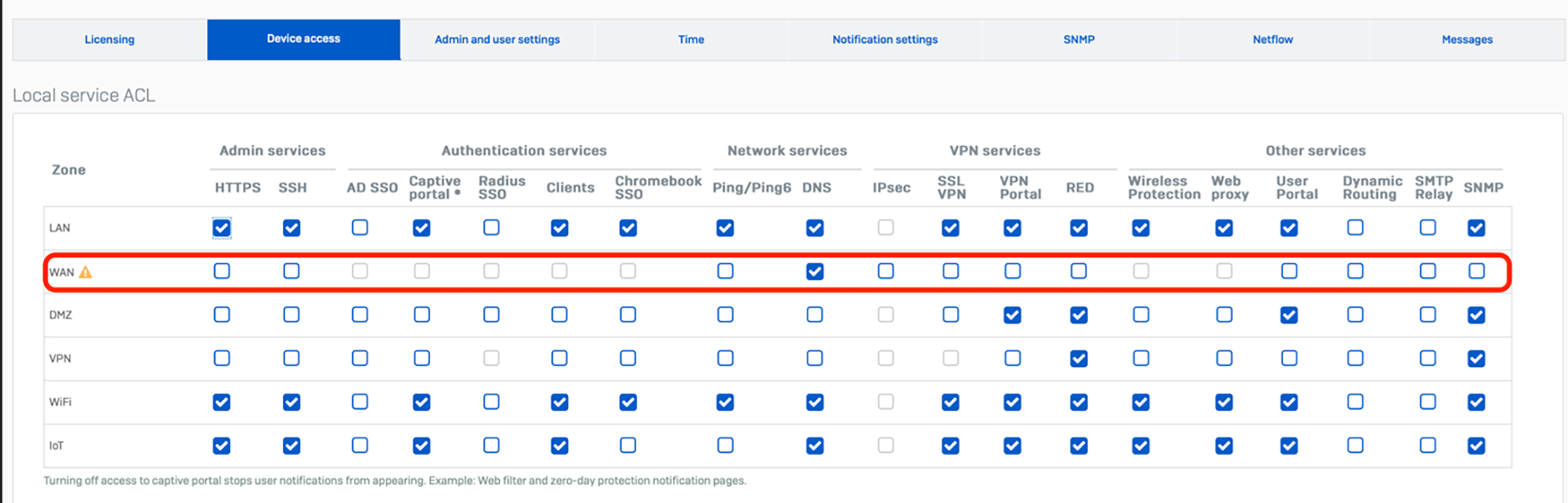 Vérifiez le contrôle d’accès à vos services locaux sous Administration > Accès à l’appareil (Administration > Device Access) et assurez-vous qu’aucun élément n’est sélectionné pour la zone WAN, sauf en cas d’absolue nécessité.
