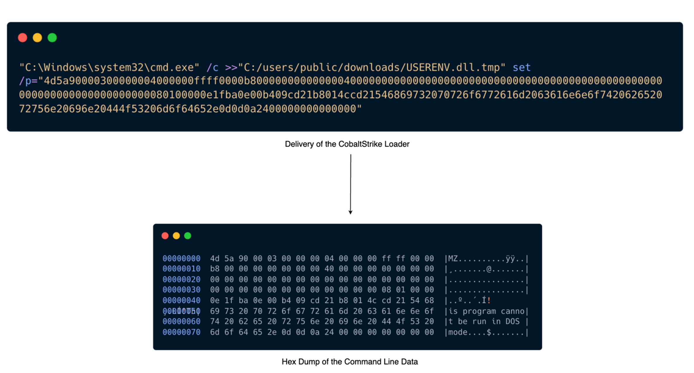 Threat actors deployed a unique Cobalt Strike loader with the filename USERENV.dll. The binary data in this loader was hex encoded and executed through command lines, specifically targeting the system’s command prompt configuration by appending data into a temporary file named USERENV.dll.tmp within the ‘C:/users/public/downloads/’ directory. Sophos detects this activity as Memory_1d (mem/cobalt-d mem/cobalt-f).