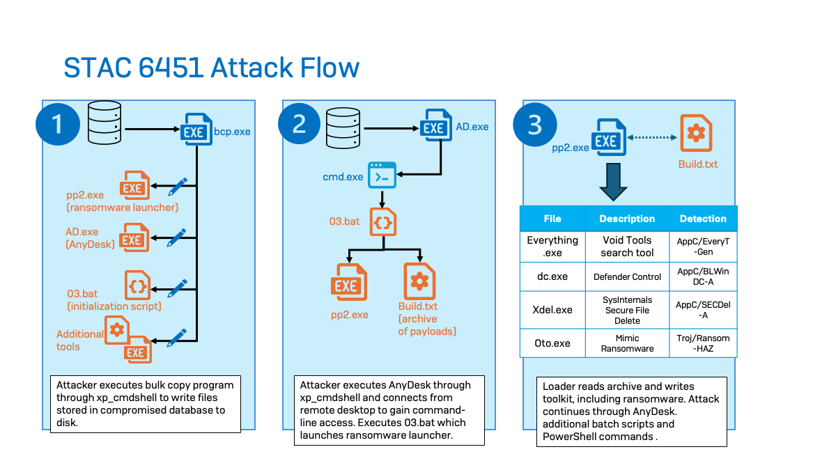 Further analysis of the incident allowed Sophos to identify additional compromises with significant overlap in tactics, techniques and procedures (TTPs), leading to the formation of a security threat activity cluster we designated as STAC6451. This cluster is primarily characterized by the abuse of SQL databases in conjunction with the use of the Bulk Copy Program (bcp) to download tools into target environments, such as RMM software and malicious files related to Mimic ransomware.