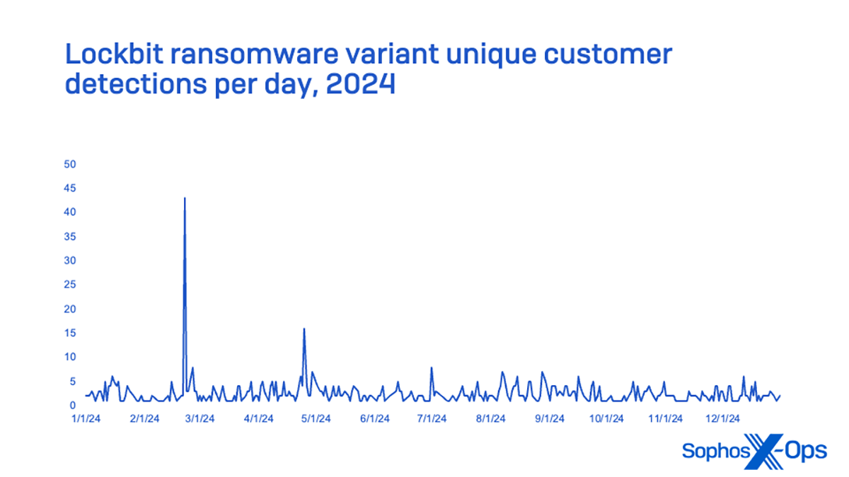 La famille de ransomware la plus détectée en 2024 était LockBit, mais pas à cause du groupe de ransomware qui l’a engendré. En février 2024, les forces de l’ordre américaines et britanniques ont déclaré avoir perturbé le groupe LockBit en saisissant les serveurs du groupe de ransomware-as-a-service, arrêtant deux de ses membres et en inculpant un autre. À la suite de cette perturbation, de nombreuses variantes basées sur le code LockBit 3.0 divulgué sont devenues actives sur le terrain, entraînant un pic de détections LockBit début 2024. Cependant, en mars, les détections ont considérablement diminué avec un léger rebond en avril et début mai (mais il se peut que le gang LockBit soit de retour un jour ou l’autre).