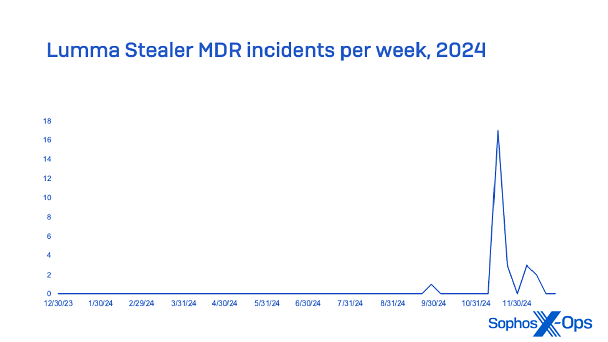 Lumma Stealer, vendu sur des forums russophones en tant que Malware-as-a-Service (MaaS), était le voleur d’informations le plus fréquemment rencontré dans les incidents MDR et le deuxième dans les rapports globaux de détection endpoint. Une campagne majeure de Lumma Stealer débutée en octobre en a fait le voleur le plus signalé au cours du dernier trimestre 2024, surpassant de loin le leader des voleurs MaaS de l’année dernière, RaccoonStealer (qui a publié une nouvelle version en 2024 après que son infrastructure a été perturbée) et éclipsant à la fin de l’année Strela Stealer (qui montait dans les classements en 2023 ; il a culminé début 2024, mais a chuté au cours du second semestre de cette même année). Aucun incident MDR enregistré en 2024 n’impliquait Strela Stealer.