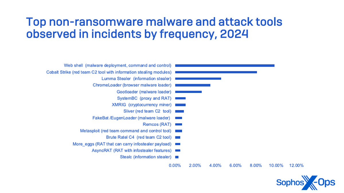 Un seul des 10 principaux outils et malwares observés dans les incidents Sophos MDR et IR n’entre pas dans cette catégorie : XMRig. Il s’agit d’un malware de minage de cryptomonnaie souvent utilisé pour générer passivement des revenus avant que l’accès ne soit vendu ou exploité d’une autre manière par un auteur de ransomware.