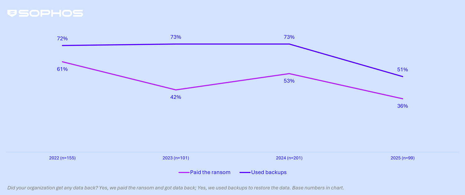 En 2025, seulement 36% des prestataires de santé ont payé la rançon, contre 61% en 2022, plaçant ainsi le secteur parmi les quatre moins susceptibles de récupérer des données de cette manière. En parallèle, l’utilisation des sauvegardes a également diminué (51%, contre 72%). Collectivement, ces résultats indiquent une résistance plus forte aux demandes, mais également de potentielles vulnérabilités ou bien un manque de confiance dans la résilience des systèmes de secours.