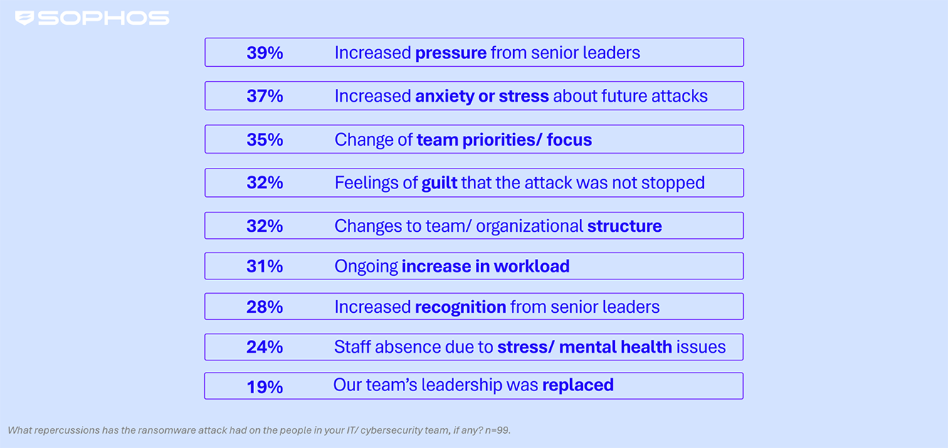 L’enquête montre clairement que le chiffrement des données lors d’une attaque par ransomware a des répercussions importantes sur les équipes IT/Cybersécurité de ce secteur, avec une pression accrue de la part des équipes dirigeantes citée par 39% des personnes interrogées. Les autres répercutions comprennent (sans s’y limiter) :