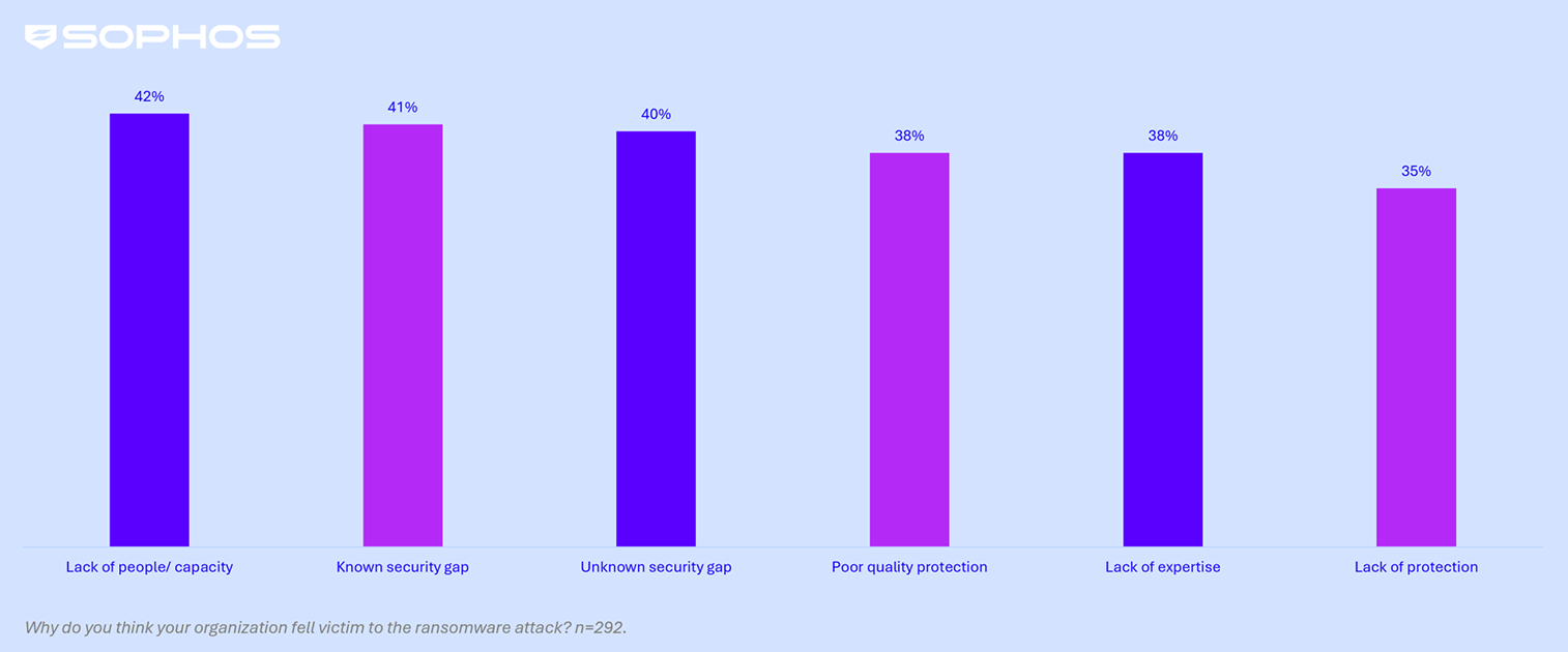 Plusieurs facteurs organisationnels contribuent au fait que les prestataires de santé soient victimes de ransomwares, le plus courant étant le manque de personnel/capacité (c’est-à-dire un nombre insuffisant d’experts en cybersécurité surveillant les systèmes au moment de l’attaque) cité par 42% des victimes. Suivent ensuite, de très près, les failles de sécurité connues, qui ont contribué à 41% des attaques.