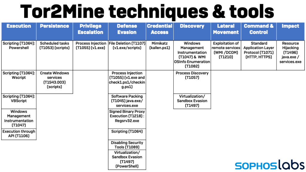 Tor2Mine uses a PowerShell script that attempts to disable malware protection, execute a miner payload and harvest Windows credentials. Using those credentials, Tor2Mine can spread itself, and will continue to re-infect other systems on the compromised network if not completely eradicated and malware protection is not present.