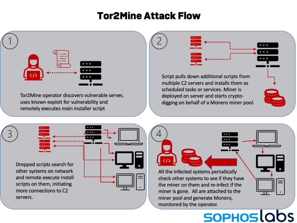 Tor2Mine , like many other miners we’ve discovered in recent cases, is almost always a sign of vulnerability to other, potentially more dangerous network intrusions. It exploits networks with known vulnerabilities on their servers to gain entry—vulnerabilities that are easily detected from the Internet by network scans looking for telltales. Miners are a low-risk way for cyber criminals to turn a vulnerability into digital cash, with the greatest risk to their cash flow being competing miners discovering the same vulnerable server that they gained entry with. But as we’ve seen in other recent cases, the same defensive gaps that allow miners to spread can lead to data and credential theft, as well as ransomware.