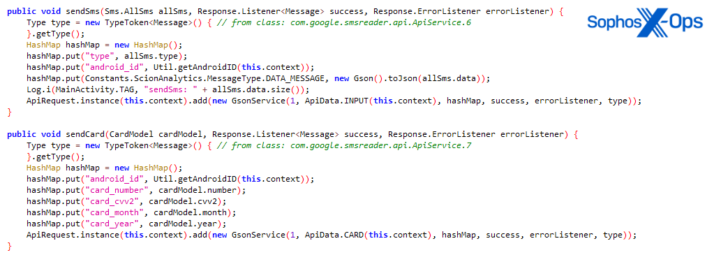 Figure 5: The malicious app’s routines for sending SMS messages and credit card details back to the attackers