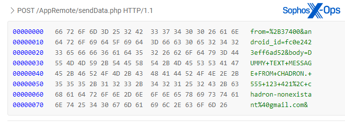 Figure 8: An example of a dummy SMS being sent back to a C2 server during our testing of the malicious apps