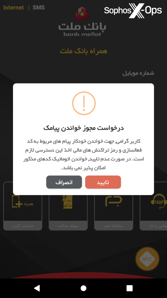 Figure 2: The malicious app impersonating Bank Mellat displays an Android permissions request message