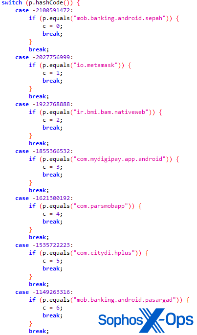 Some of the samples we collected do something strange: they search the infected device for several other apps relating to banking, payment, or cryptocurrency. The list of apps is hardcoded in the malware.