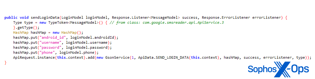 Figure 4: An excerpt from one of the malicious apps, showing the routine for sending stolen credentials back to the C2 server