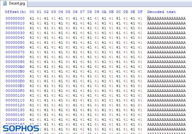 The above two images compare an encrypted file Desert.jpg, a sample picture from a default Windows 7 machine. Both DearCry and WannaCry add their name at the beginning of the file. Furthermore, in WannaCry the highlighted parts represent file type and the size of the original unencrypted file. File type at offset 0x010C and file size at offset 0x0110.