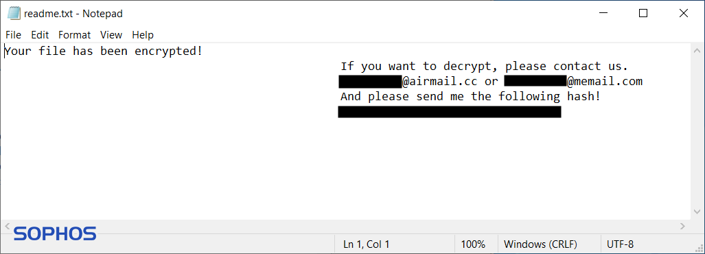 To inform victims about what happened and who they must contact, a file ‘readme.txt’ is dropped in every folder containing the word ‘desktop’ and in the root folder of the system disk. This ransom note contains two e-mail addresses and a hash. This hash is an identifier, so the attacker knows what decryption key is associated with the specific attack.
