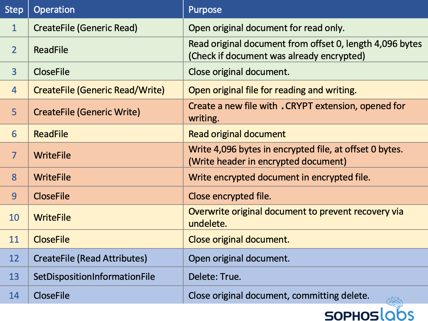 File system behavior of WannaCry. Step 8 = Copy. Step 13 = In-Place.