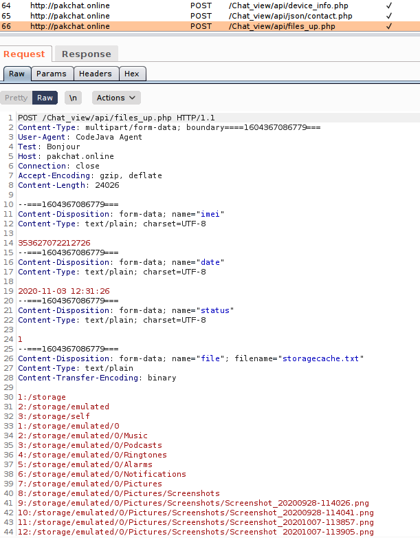 Spyware exfiltrating the SD card directory listing (in the form of an HTTP POST submission in clear text, in this case)