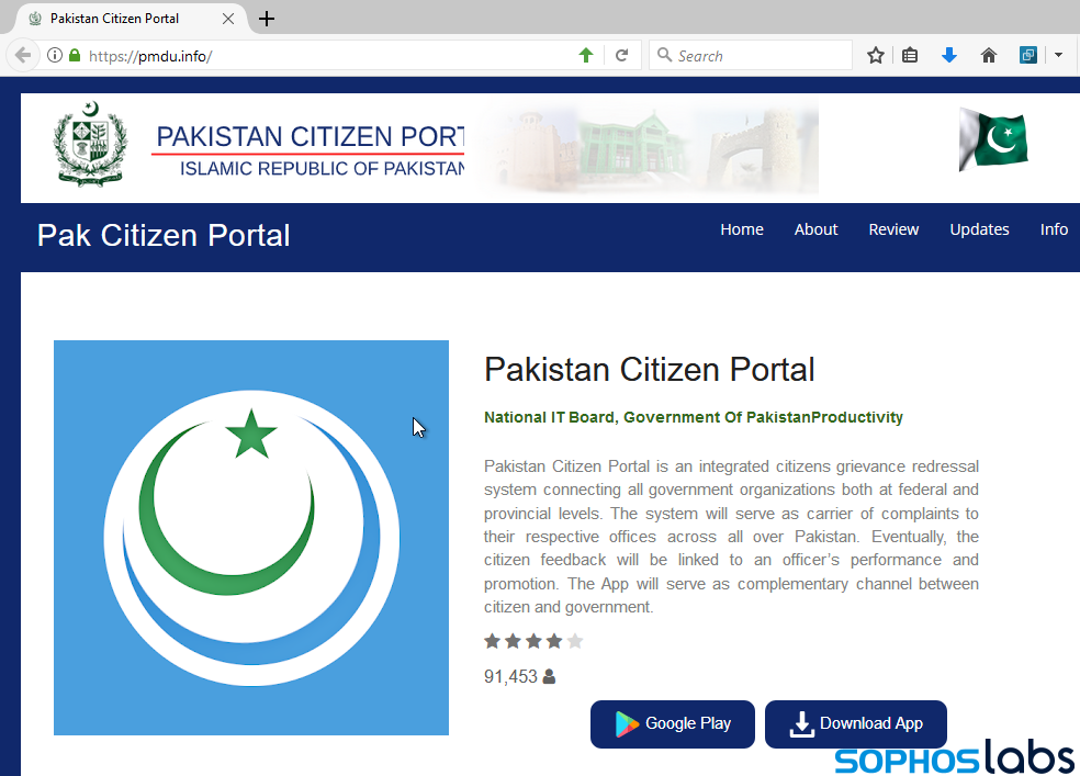Targets of the malware may have received links via SMS messages or email instructing them to download the app from the fake Pakistan Citizen Portal webpage. Why someone would then deface a web page to add the bogus domain is harder to understand.