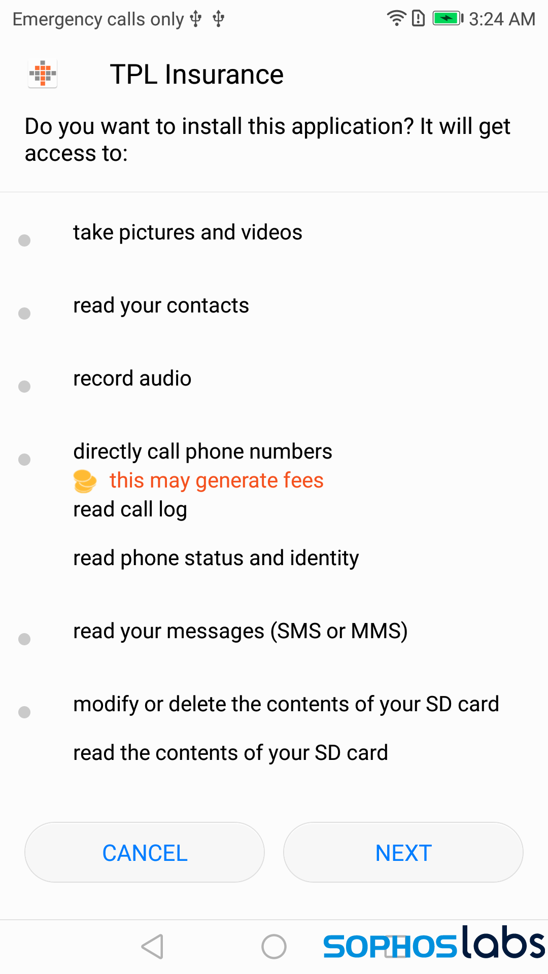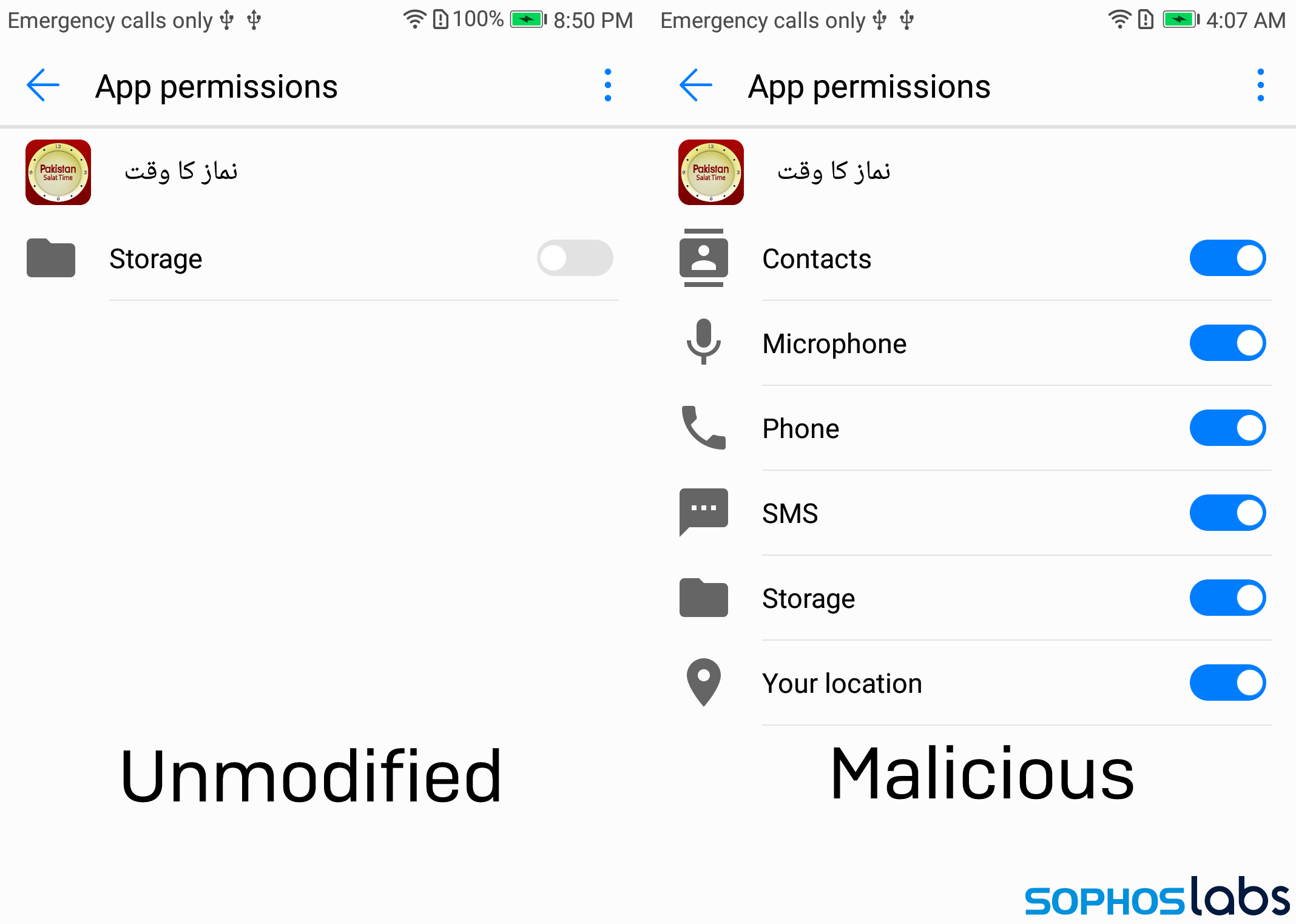 The selection of apps is highly peculiar, as they are neither the most popular, nor particularly unique, apps. There’s no indication that the publishers of the original apps are aware that these Trojanized versions even exist. The highest-profile app Trojanized in this way is the Pakistan Citizen Portal app, published by the government of Pakistan, but the Trojanized version never appeared in any legitimate market, as far as we know. (SophosLabs made multiple attempts to disclose this information to the government of Pakistan, the publisher of the app, prior to publication.)