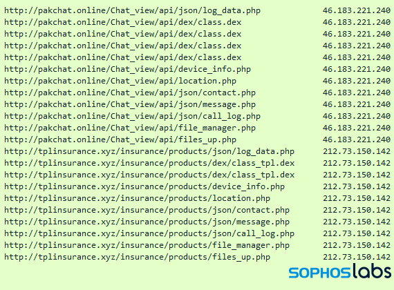 The operators of this malicious network also registered domain names that seem to correlate with the apps they mimic. The Pakistan Chat app (as well as a few others) connect to the domain pakchat.online, hosted on a server in Latvia, while the fake TPL Insurance app uploads its stolen data to, and retrieves the DEX file from, the domain tplinsurance.xyz, hosted on a server in Bulgaria. The Pakistan Salat Time app, unusually, used a hostname from a dynamic DNS service, kv33.zapto.org, as its C2. That domain resolved to an IP address based in the USA.