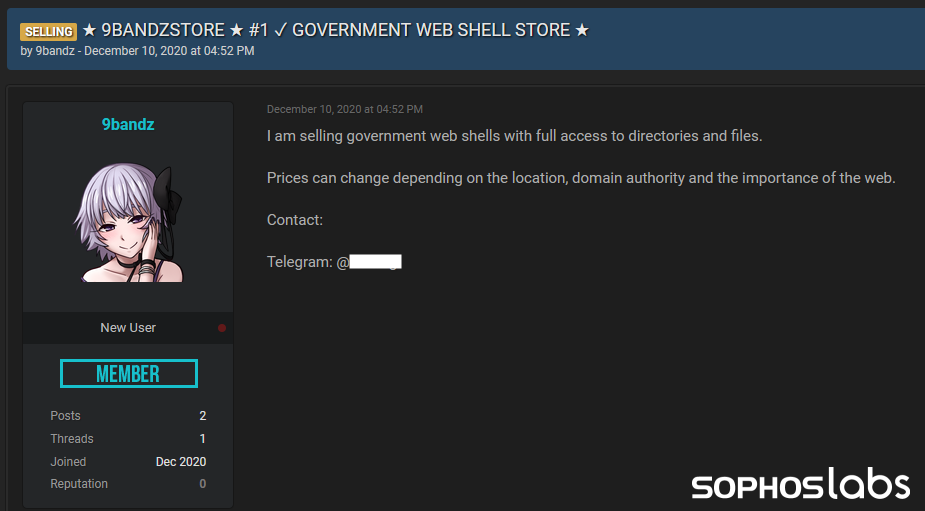 A cursory search for this name revealed at least 93 websites that have been identically defaced, their contents replaced with a similar message since October, 2020. A user of a crimeware forum with a user with the same name also posted this advertisement for “selling government web shells with full access to directories and files” in December.