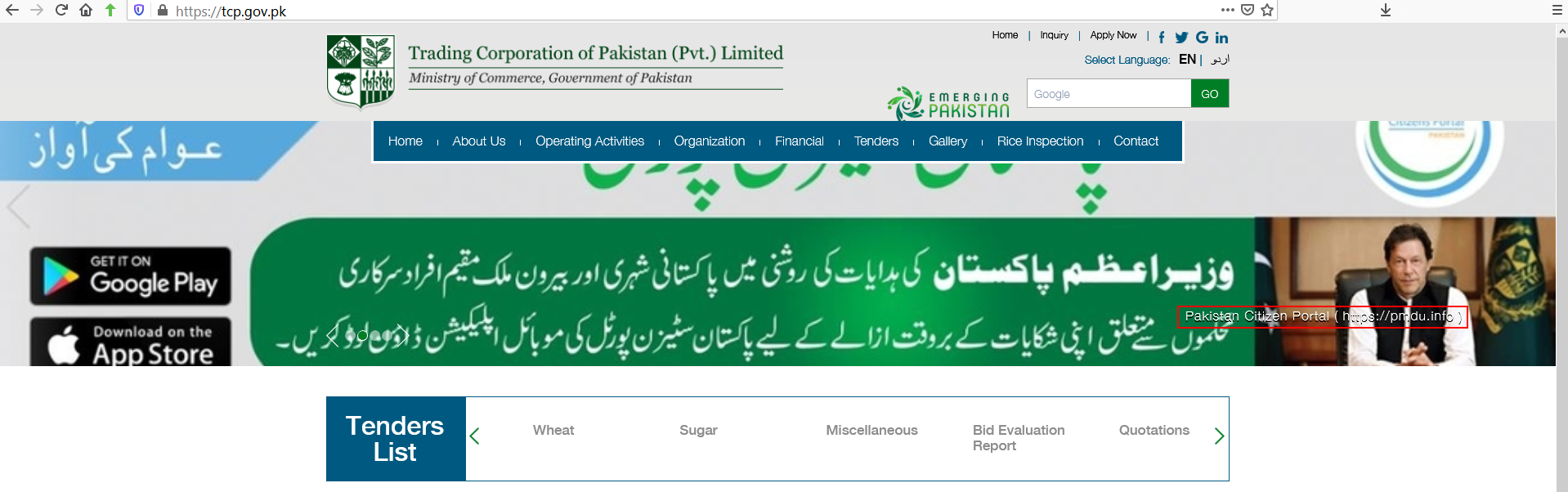 While digging around for links to the .info version of the domain, we stumbled upon a reference to the domain hosting the malware in a surprising location: Atop the page for an official Pakistani governmental department, the Trading Corporation of Pakistan (or TCP).