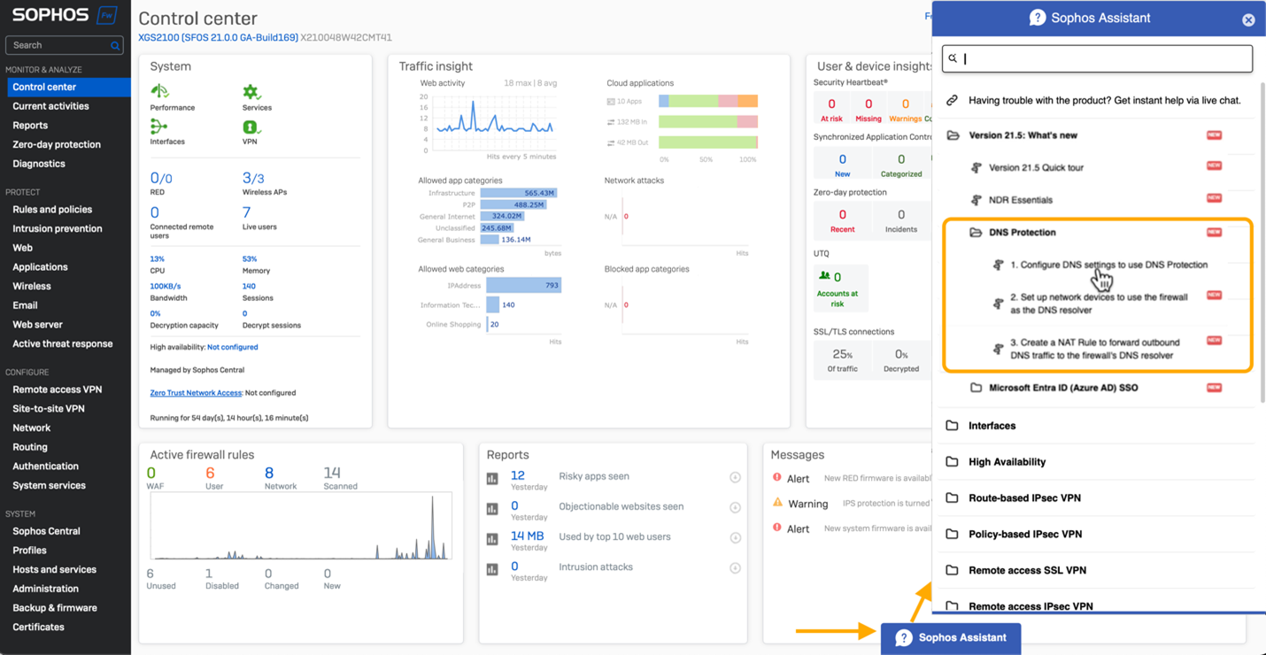 Sono disponibili anche esercitazioni guidate che illustrano i passaggi per impostare la protezione DNS sul firewall, sui dispositivi e persino per impostare una regola NAT per rafforzare la protezione DNS. Fate clic su “Assistente Sophos” nella parte inferiore della schermata del Control Center per accedere a queste visite guidate.