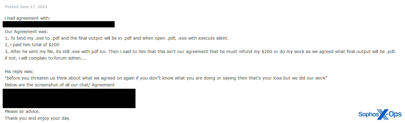 But it’s not just databases. Here’s an example from Exploit, where one user paid $200 USD to another user to bind an executable (presumably malware) to a PDF. The buyer raised a scam report because, rather than binding the executable, the user simply gave the file a PDF icon.