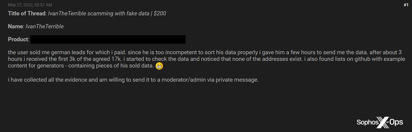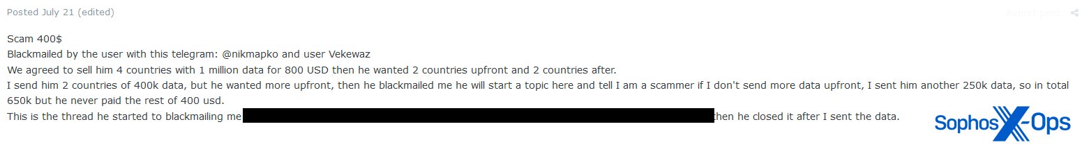 We noted one allegation of blackmail in the scam reports we examined, and it didn’t appear to be a particularly egregious one. The complainant, a database seller, alleged that a buyer threatened to accuse him of being a scammer if he didn’t send more data for free.