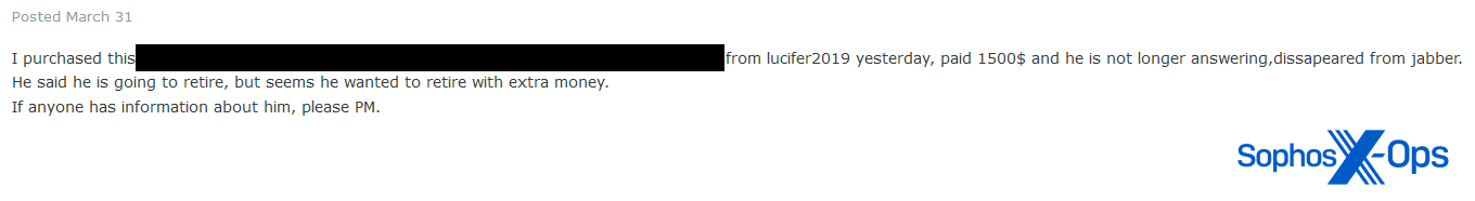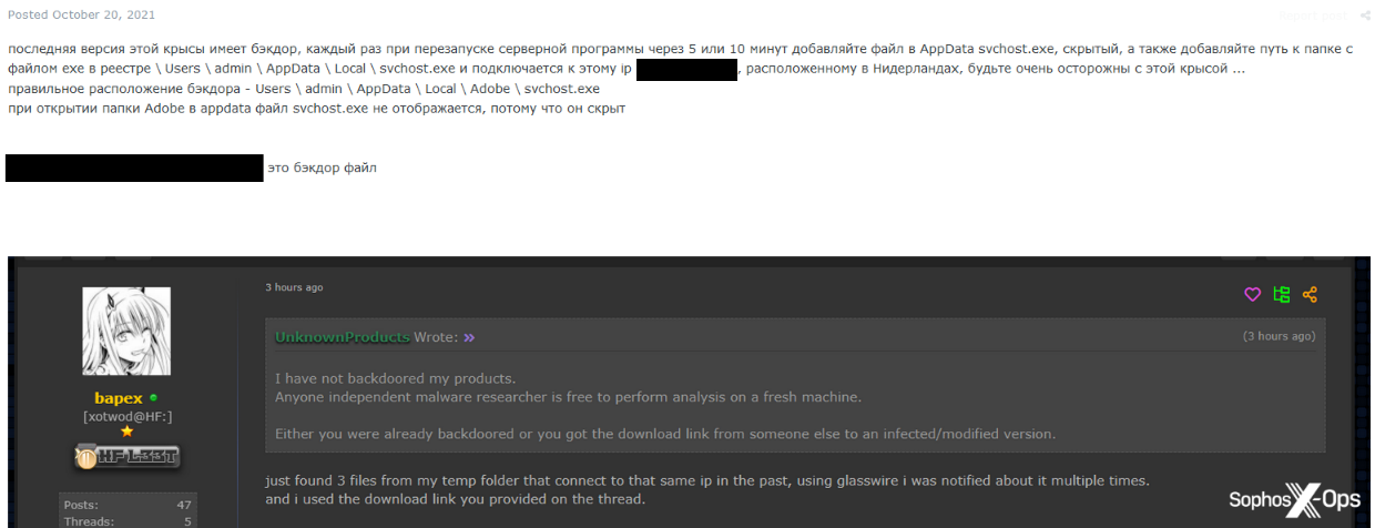 Moving on to more sophisticated attacks, we saw several scam reports about backdoored malware – that is, malware sold or distributed on the forums which contains code designed to covertly attack its operators and steal their data.