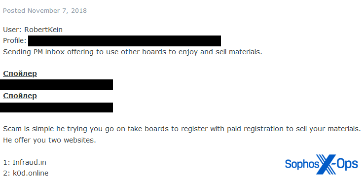 We noted numerous instances of typosquatting, phishing, and scam forum sites designed to either trick users out of a ‘registration fee’ or to steal credentials for genuine criminal marketplaces (with possible motivations including theft of cryptocurrency, impersonating users for future scams, or ruining users’ reputations).