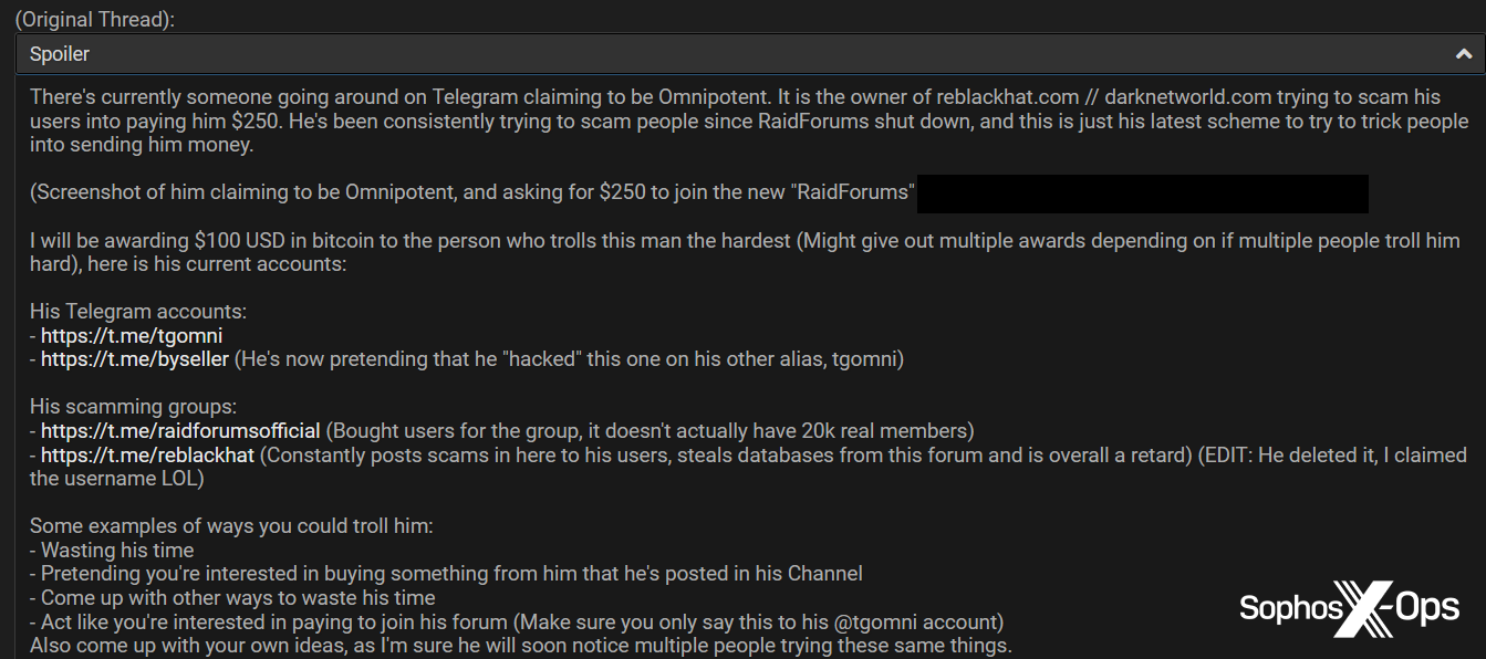 Following the news that a scammer was pretending to be Omnipotent (one of the founders and administrators of RaidForums) to trick users into paying $250 to join the ‘new RaidForums,’ the BreachForums administrator started a contest: $100 to whoever “trolls this man the hardest.”