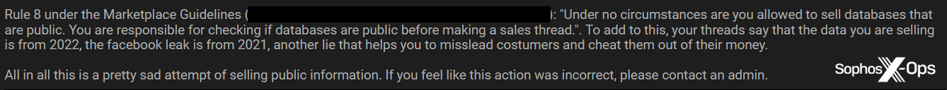 Finally, the BreachForums administrator scammed a scammer personally. An individual registered a Telegram username very similar to BreachForums, and was offering public databases for sale.