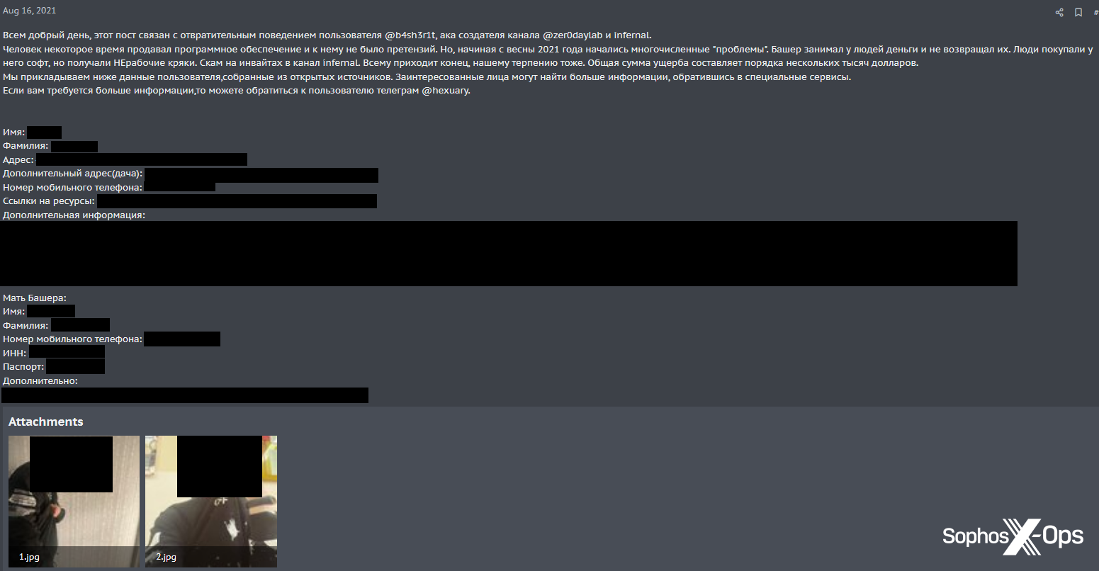 An XSS user annoyed at an alleged scammer for selling non-working tools and sending scam invites, doxed them – revealing their name, address, mobile phone number, and social media profiles, and their mother’s name, phone number, and passport number. The accuser threw in a couple of photographs for good measure.