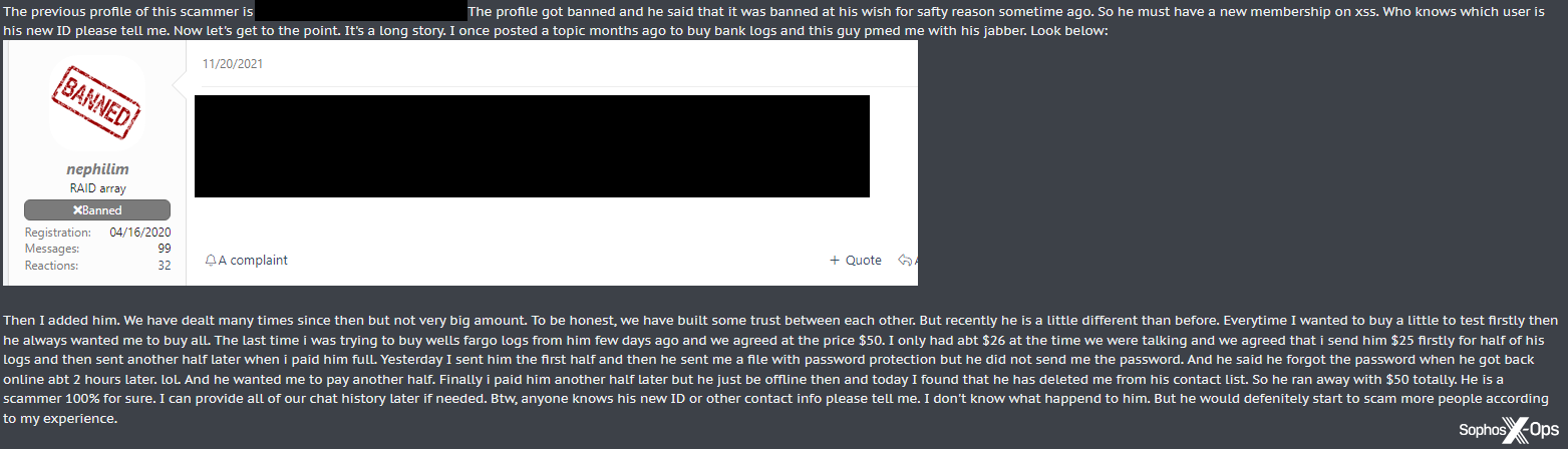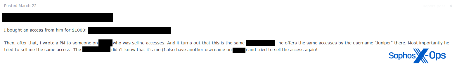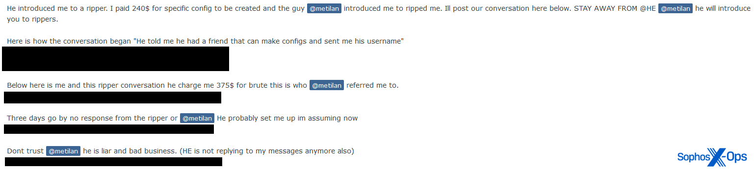 Occasionally, scammers will use multiple profiles for other purposes. In one Exploit report, for example, a user claimed that an individual was operating accounts on both Exploit and XSS under different names to sell the same product, an AaaS listing, multiple times (we briefly examined reselling in our recent white paper on multiple attackers).