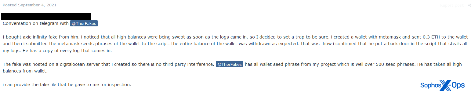 Figure 22: A scam report about a backdoored fake copy of Axie Infinity