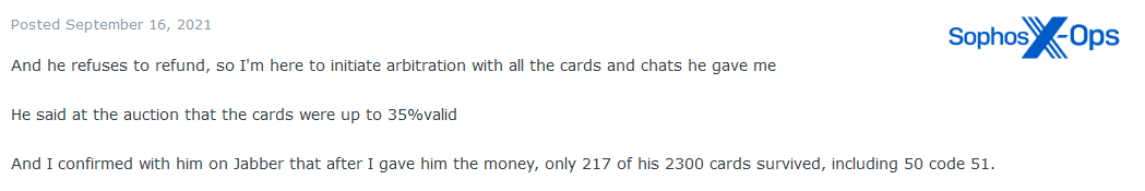Figure 8: A scam report involving higher percentages of invalid card data than advertised. Note that the complainant in this case was subsequently banned for scamming!