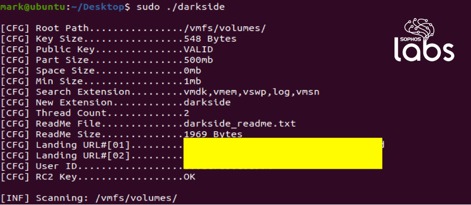 Linux 版のコンソール出力を見ると、このランサムウェアは VMWare の ESX のようなハイパーバイザー OS を含む Linux 上の仮想ハードディスクドライブに関連するファイル拡張子を特に検索していることがわかります。仮想マシンの仮想ハードディスクドライブは、「/vmfs/volumes/」というファイルパスの下に保存されています。