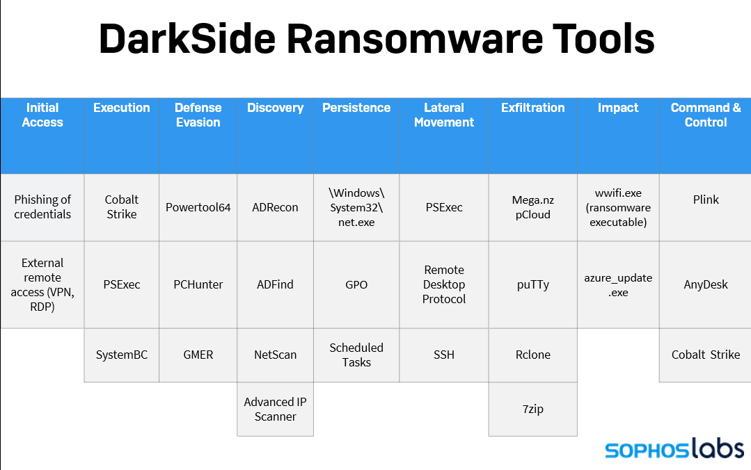 ソフォスによる DarkSide 攻撃のデータフォレンジックやインシデント対応の過去の経験からすると、標的のネットワークへの最初のアクセスは、主にフィッシングで入手した認証情報によるものです。ランサムウェア攻撃者が足がかりを得る方法は他にもありますが、この種のランサムウェアを扱う場合、アフィリエイトが好む傾向から、このような方法が一般的であるようです。