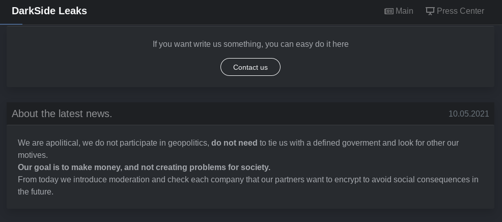グループはリークサイトをプラットフォームとして都合の悪い報道に対応し、その「義賊」としての評判を守っていました。例えばランサムウェアからの復旧を請け負う企業 Coveware が、DarkSide はイランのホスティングを利用しているため企業が支払いを行うと制裁措置に抵触する可能性がある、と警告したところ、DarkSide 側は「プレスリリース」を掲載し、イランの IT サービスを利用している事実を否定しました。しかし Colonial への攻撃は DarkSide グループを再び後退させ、Web ページ上でグループの目標として「政治的意図はない」、「収益を上げることであり、社会問題を起こすことではない」と述べています。
