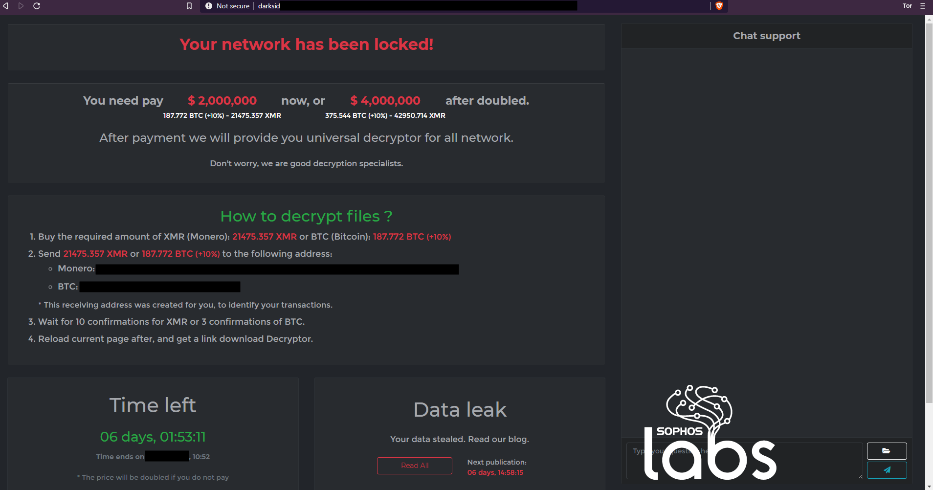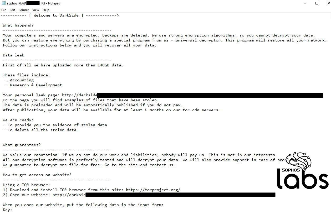 DarkSide は、REvil、Maze、LockBit などの二重恐喝型ランサムウェアの流れを汲み、企業のデータを盗み出して暗号化し、復号鍵の代金を支払わなければ公開すると脅します。他の標的型ランサムウェアと同様に、DarkSide も多額の身代金要求をおこないます。Sophos Rapid Response が昨年対応したある事例では、400 万ドルが要求されました (支払いはされていません)。