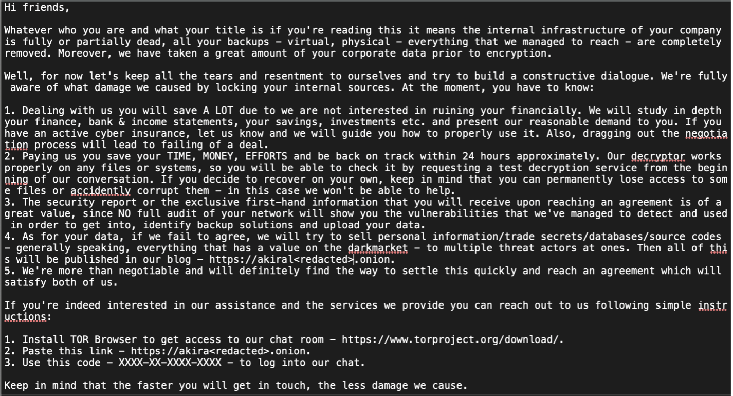 これらのインシデントは 2 つの異なる攻撃者による攻撃だと思われますが、どちらも最近出現したランサムウェア「Akira」を配信していました。どちらの事例でも、被害を受けた組織のファイルは「.akira」という拡張子で暗号化され、攻撃の過程で fn.txt という、ほぼ同一のランサムノート (身代金要求文書) がドロップされました (以下の図 1 で紹介しています)。