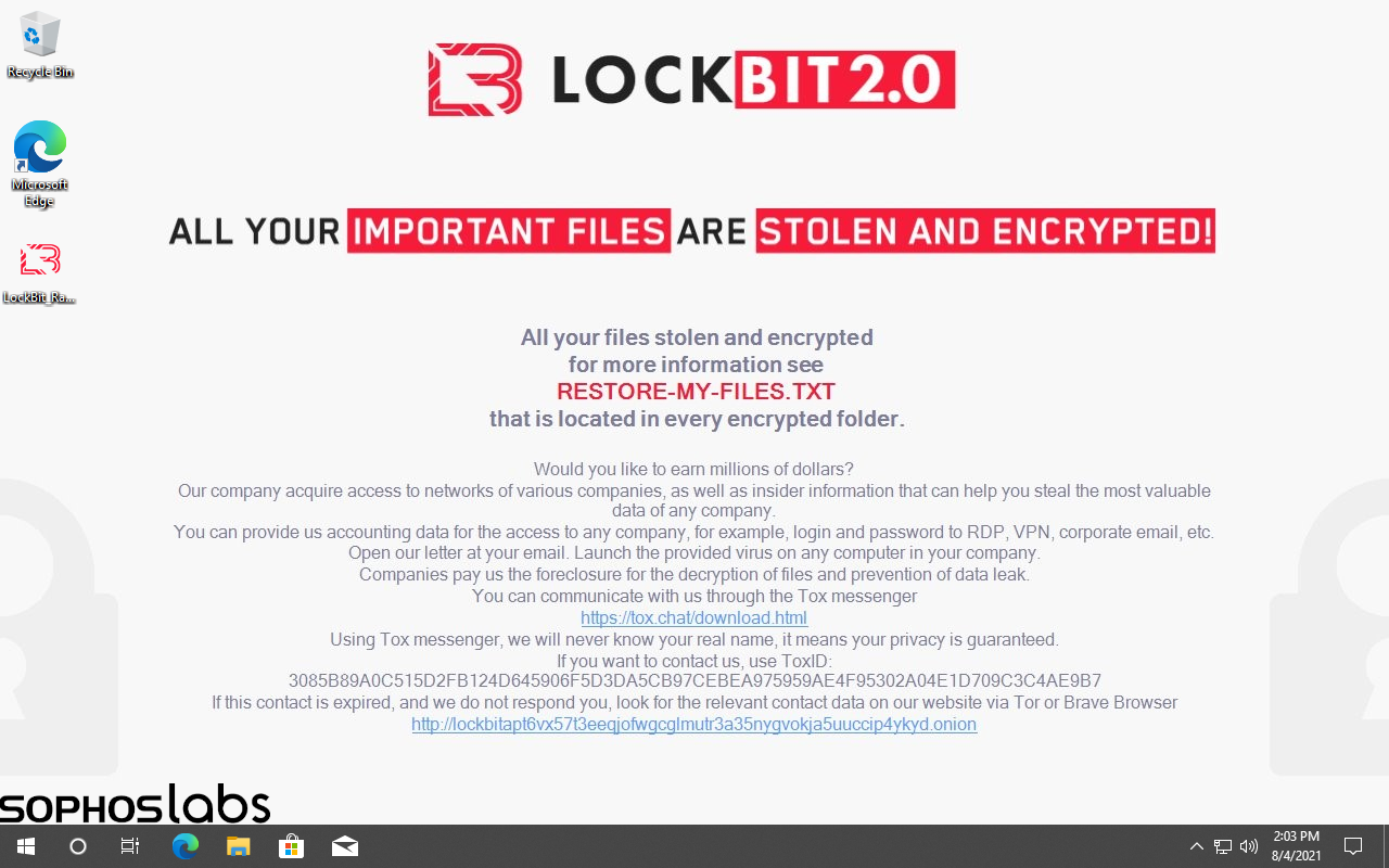 DarkSide (および REvil) は RaaS の舞台から姿を消したようですが、ランサムウェア LockBit 2.0 による攻撃は増加していることを確認しました。昨今 LockBit によって設定される身代金要求の壁紙には、身代金を獲得するためネットワークへの侵入と暗号化に協力する初期アクセスブローカー (企業の内部関係者など) を募集する求人が含まれています。