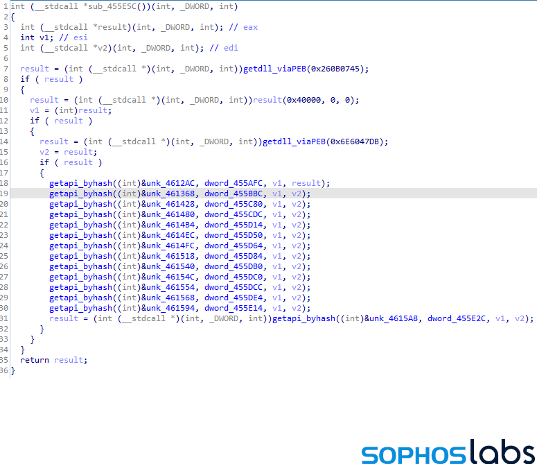DarkSide (および REvil) と同様に、BlackMatter はマルウェアの静的解析を妨げることのできるランタイム API を利用しています。また、実行中に文字列を暗号化して公開する点も他の2 つのランサムウェアグループと共通しています。これらの技術はいずれも最近の多くのマルウェアに共通するものですが、BlackMatter のランタイム API および文字列復号機能は DarkSide や REvil に見られるものと非常によく似ています。