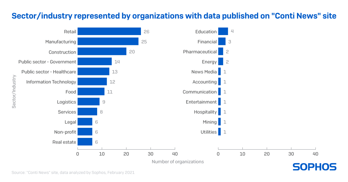 Conti は登場した当時から、Ryuk の後継であると考えられていましたが、Conti の攻撃グループは盗み出したデータを流出させると被害者を脅して身代金の支払いを要求する点が、Ryuk とは決定的に異なります。盗んだデータがこのように利用されるということは、ほぼすべての業界が標的になる可能性があることを意味します。ただし、Conti の攻撃グループは小売業、製造業、建設業、公共機関の組織を標的にすることが多くなっています。