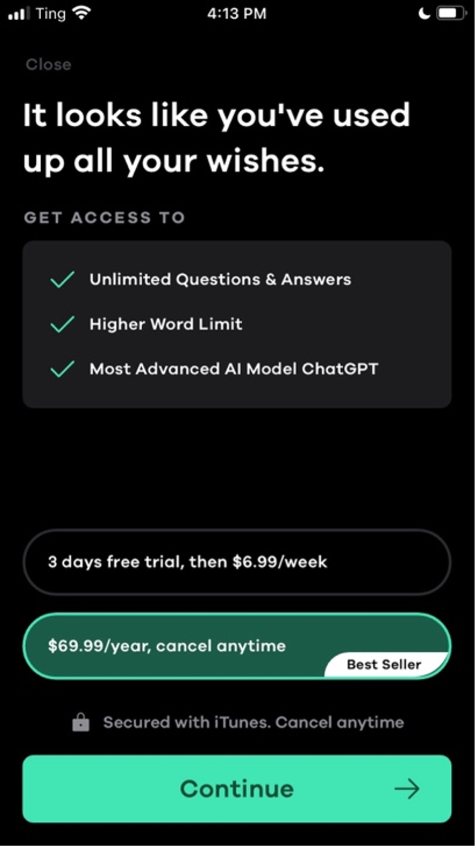 「続きを読む」リンクをタップすると、3 日間の無料トライアルに参加するか、月額または年額サブスクリプションの前払いを要求するプロンプトが表示されます。また、1 日あたり 10 件のクエリ制限を設け、制限に達した場合は「プレミアム版」の購入を促します。