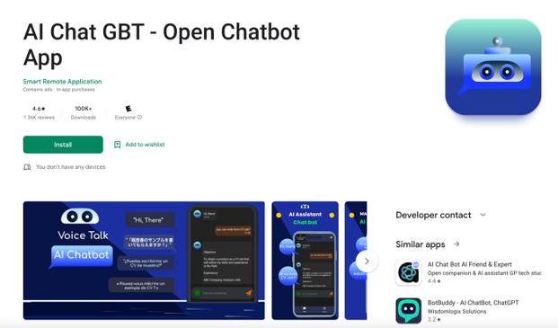 チャットボットを装ったフリースウェア (「FleeceGPT」) に関する調査は、Sophos X-Ops の主任研究員 Andrew Brandt が最近、「Chat GBT」という Android アプリケーションの広告をモバイルニュースアプリで発見したことから始まりました。Google Play ストアのリストには、ChatGPT の開発元である OpenAI のロゴに類似した画像が表示され、アプリの開発者はこのアプリを「ChatGPT の代替品」で、「Chat GPT というモデルをトレーニングしたもの」だと主張しています。