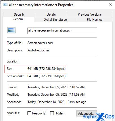 解凍またはアーカイブから復元されたペイロードファイルの多くは、一般的な実行ファイルよりもはるかに大きなサイズです。私たちが発見したサンプルのいくつかは、600MB をはるかに超えていました。このような大容量のファイルは、より小さなファイルを処理するように設計された静的エンドポイント保護スキャナでは見逃される可能性があります。
